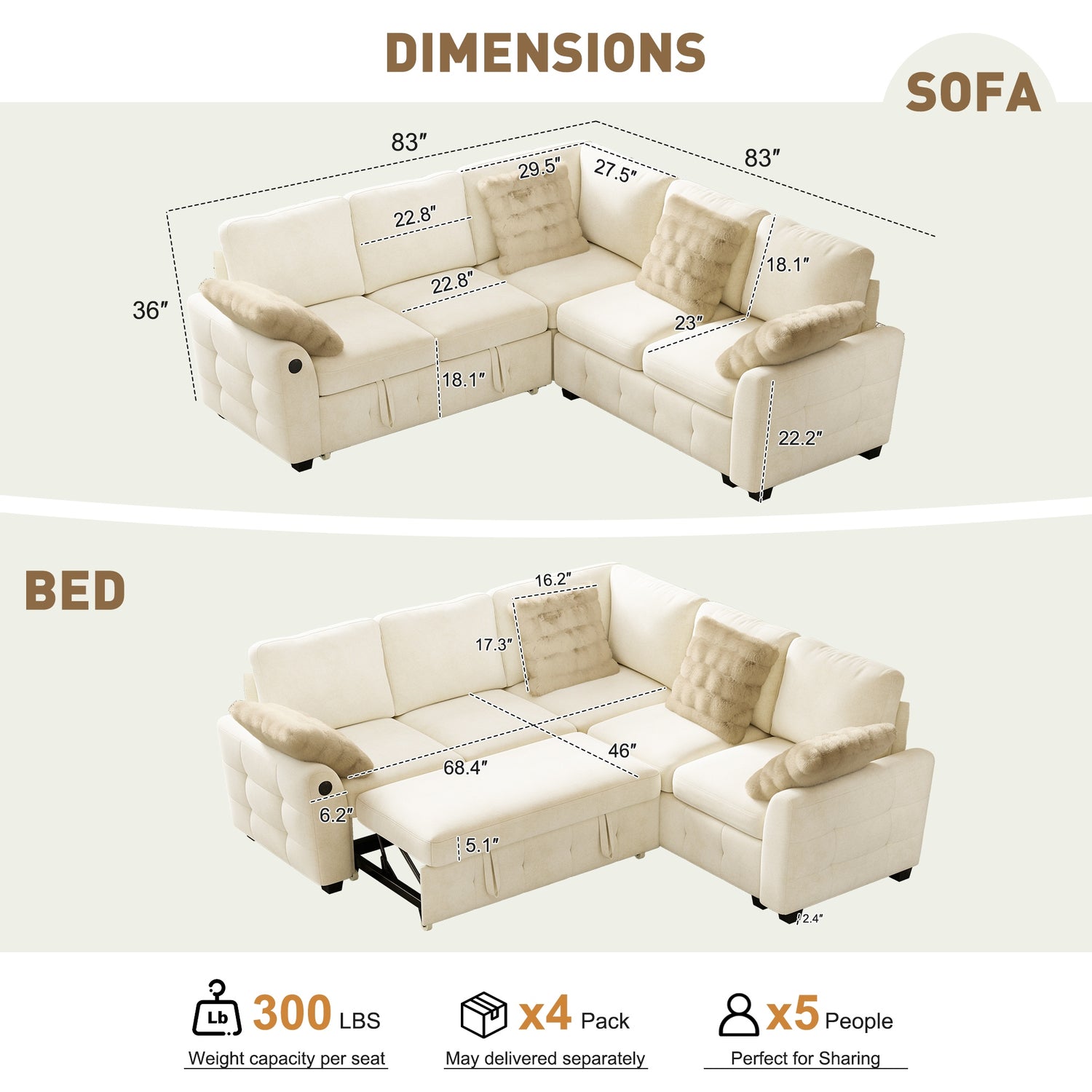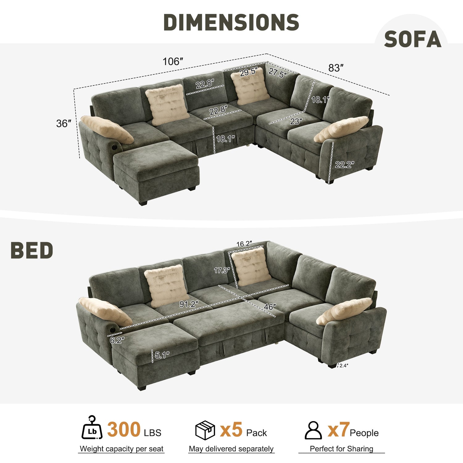 5 Seat Sleeper: 23"D x 83"W x 36"H