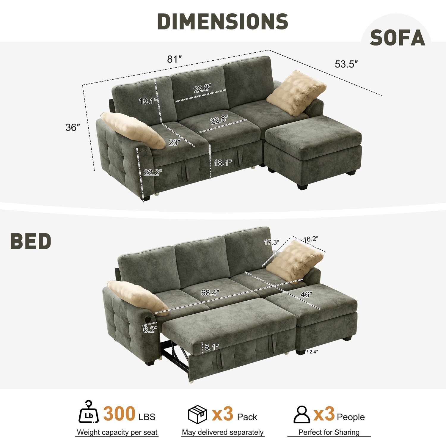 3 Seat Sleeper: 23"D x 81"W x 36"H