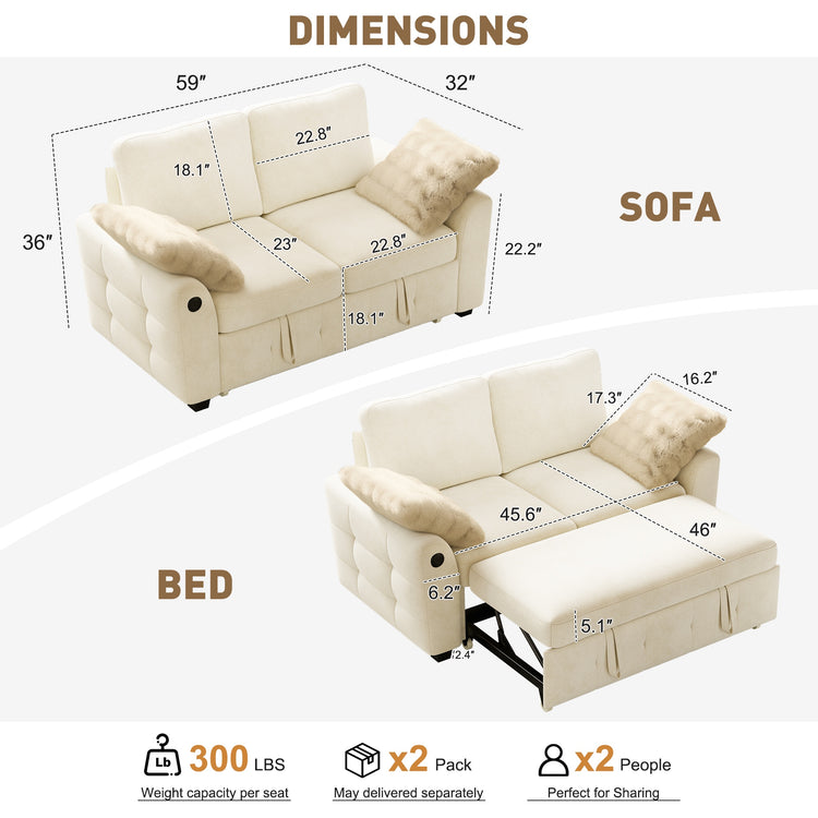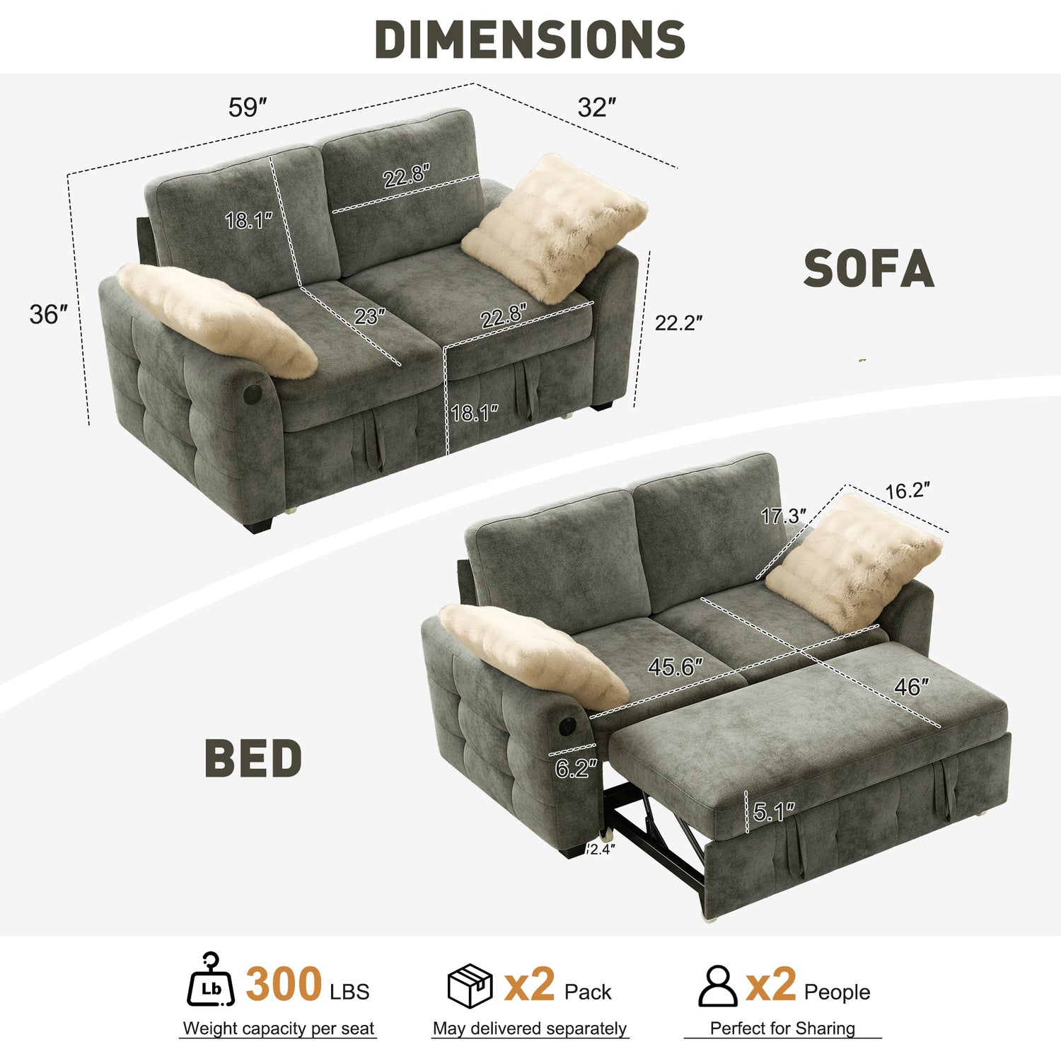 2 Seat Sleeper: 23"D x 59"W x 36"H