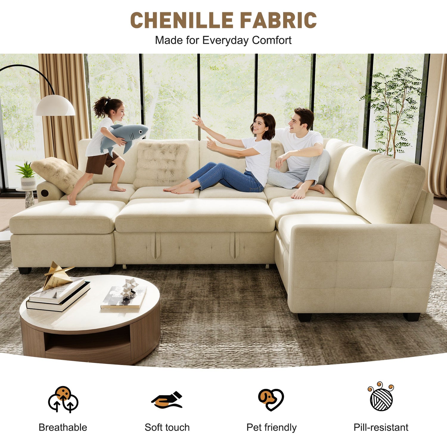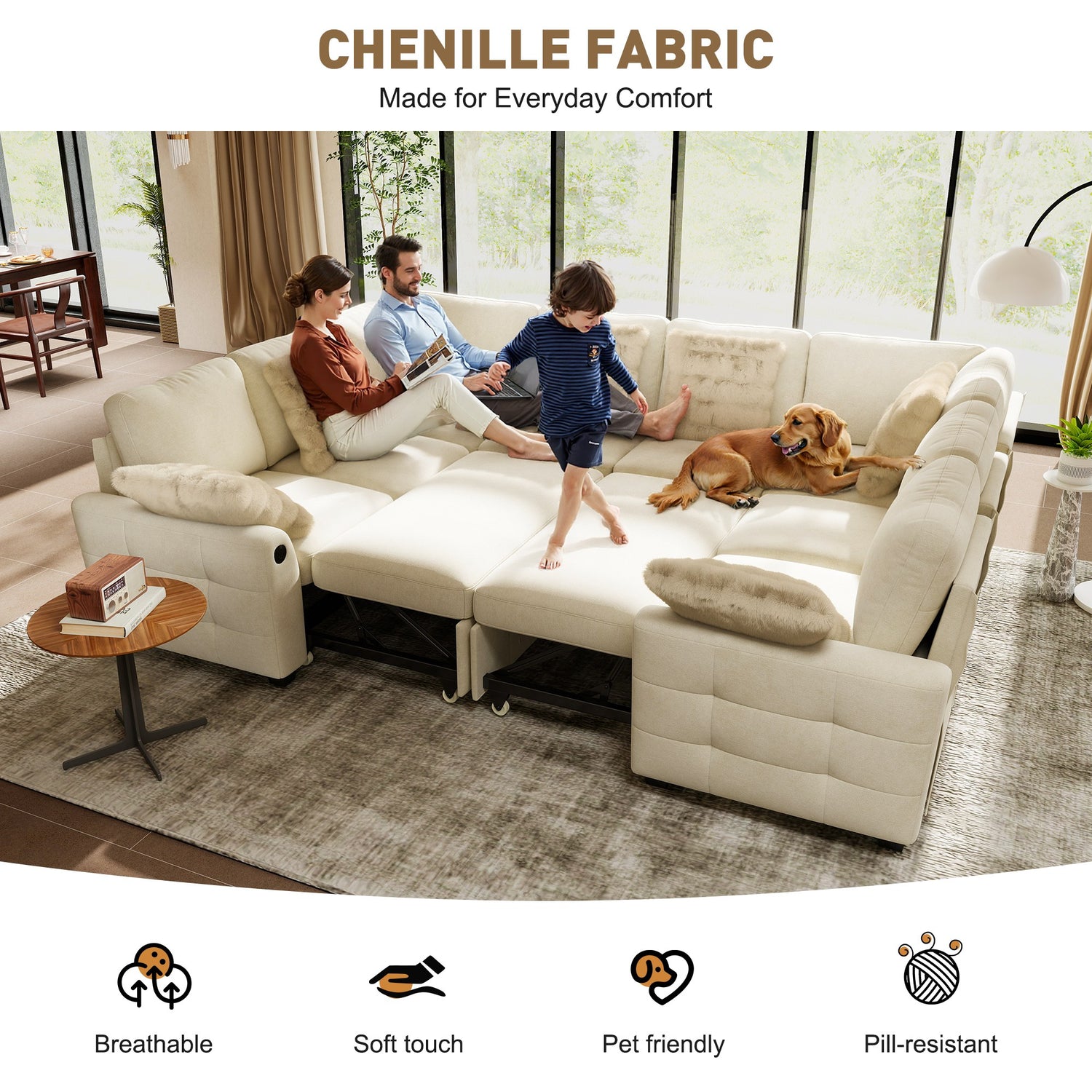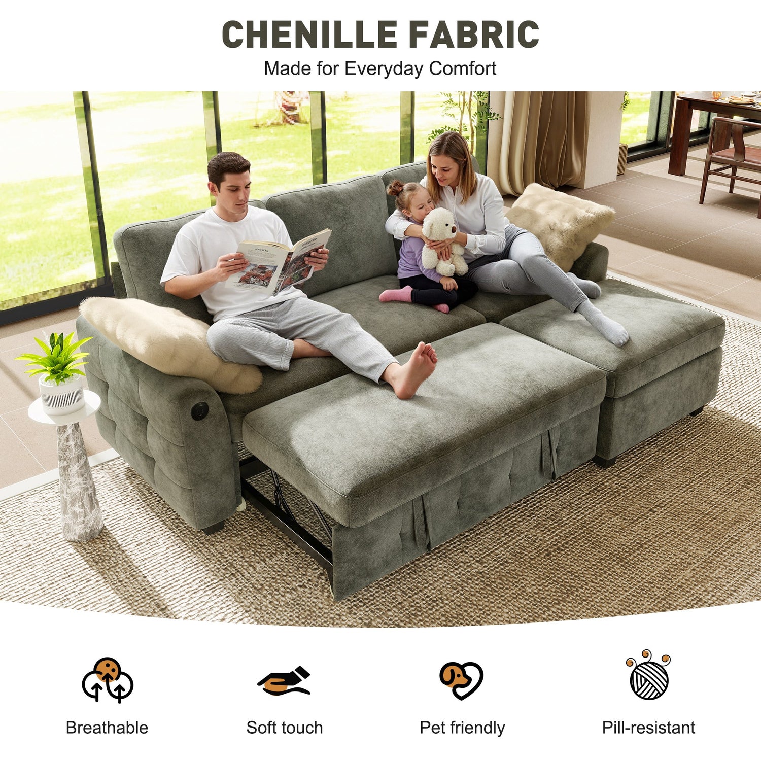 Upholstered in a pet-friendly chenille fabric, it’s made to handle real life with ease. The fabric is durable, resistant to everyday wear, and easy to clean—ideal for homes with pets, kids, or frequent guests.